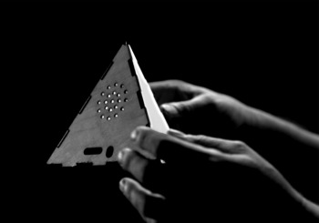 Others may need an explanation, so here goes: The Tetrafol is a hand-held tangible electronic sound toy. Circuits enclosed by a wooden tetrahedron detect orientation and motion-gestures to modify the playback of a collection of Fol Chen's micro-compositions. Users can explore sound through objectual physical manipulation. The battery-powered device has its own internal speaker but can additionally be hooked up to a headphone or amplifier for broader consumption and recording purposes.