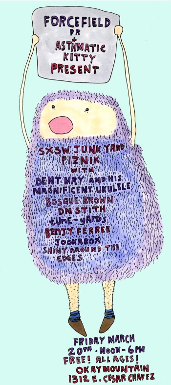Here’s who’s showing up: Shiny Around the Edges, Benjy Ferree, Tune-Yards, Jookabox, Dent May & His Magnificent Ukulele, DM Stith, Bosque Brown. What a lineup! You can test the waters by launching an AKradio playlist with choice songs from the above by clicking here (click here to download a zip of all seven songs). Click more to see times and a really cute, hairy-legged promo poster.