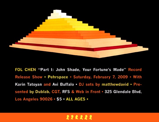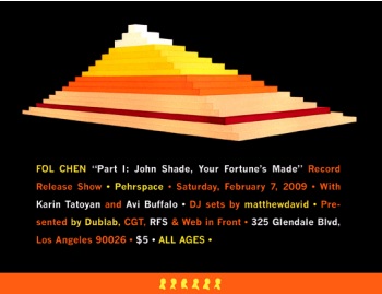 Also, the webpage Fol Chen’s upcoming Part I: John Shade, Your Fortune’s Made, is newly minted with some fresh mp3s, including remixes by Matthew David and Clifford Lidell. Click here to listen.
