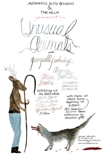 If you’re reading this and you live in or near Tacoma, Washington, please consider seeing the Unusual Animals event this evening, hosted by The Helm. Art starts at 5pm, and the music at 6:30pm. Art includes dear friends of the label the Bents, and music headlines Grampall Jookabox.