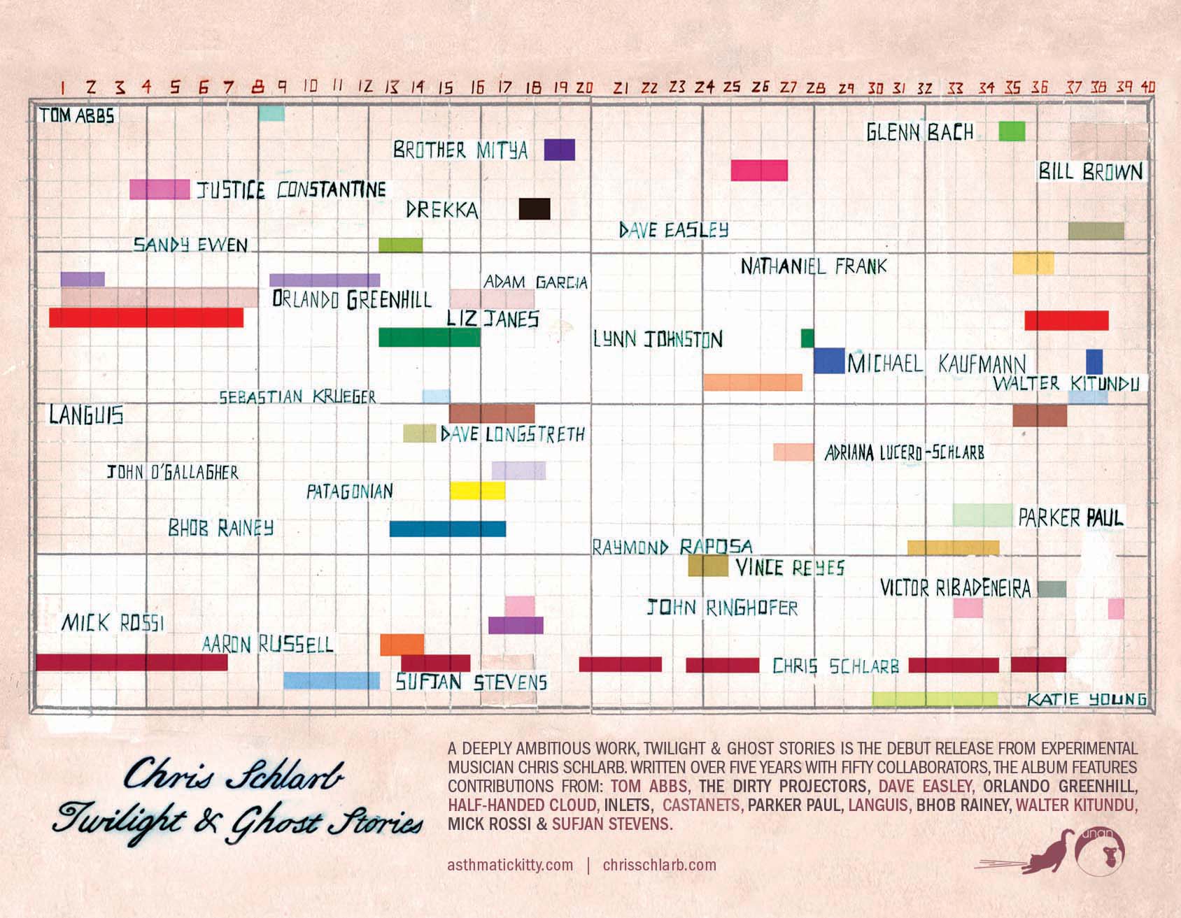On an overcast Wednesday in the middle of February 2003, Chris Schlarb, struggling with child custody issues, unemployment, and a declining passion for music, set up two microphones to capture the sound of the rain outside his near-empty apartment in Long Beach. That spontaneous idea gradually snowballed into a project that would cross four years, correspondence with dozens of musicians, and more than two hundred hours of work. Calling upon a diverse number of collaborators, Chris began to solicit musical phrases, incidental conversations, stories and textures. Few artists were offered more than a vague description of the project and none of the artists involved heard the final mix until the album’s release. Schlarb says of Twilight: "Four years and fifty collaborators later, Twilight & Ghost Stories seems an odd choice for my first “solo” album. There are hundreds of moments taken from their chronology in time and set alongside each other anew and I have acted only as the conductor of a giant, magnificent orchestra. To that orchestra, in some small way, I owe my life."